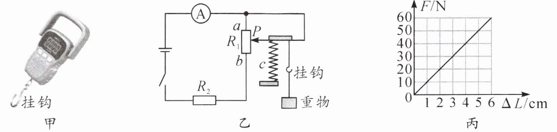 9. 李明家购买了一款如图甲所示的电子秤,他通过上网查询发现该电子秤内部电路简化如图乙所示。电路中电源电压恒为3 V,显示屏上的示数表由电流表改装而成,$R_{1}$是一根长6 cm且阻值为15 Ω的均匀电阻丝,$R_{2}$是一个定值电阻,不称重物时滑片P在电阻丝的a端,所称重物最大时P在电阻丝的b端,此时电流表示数为0.6 A;弹簧c受到的压力F与压缩量$\Delta L$的关系如图丙所示。(已知挂钩的重力不计,在称量物体质量时压力F的大小等于所称重物的重力;在横截面积一定时,电阻丝接入电路中的电阻大小与其接入电路中的长度成正比)。通过计算回答: