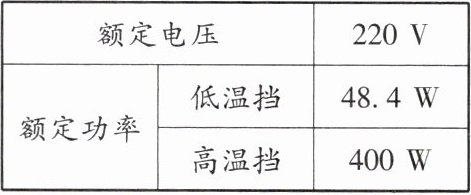 (3)低温挡时,$R_1$与$R_2$串联,电路总电阻$R_{总} = \frac{U^2}{P_{低}} = \frac{(220V)^2}{48.4W} = 1000Ω$,高温挡时,只有$R_1$工作,$R_1$的阻值$R_1 = \frac{U^2}{P_{高}} = \frac{(220V)^2}{400W} = 121Ω$,根据串联电路电阻特点$R_{总} = R_1 + R_2$,可得$R_2 = R_{总} - R_1 = 1000Ω - 121Ω = 879Ω$。