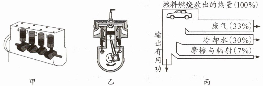 (2)观察图丙,我们可以看到内燃机的能量流向图,其中燃料燃烧放出的热量被分配到了不同的部分:废气带走了$33\%$的能量,冷却水带走了$30\%$的能量,摩擦与辐射消耗了$7\%$的能量,而剩余的部分则是输出有用功。因此,热机效率可以通过计算输出有用功所占的比例来得到。具体计算如下:热机效率 = $100\%$ - 废气带走的能量比例 - 冷却水带走的能量比例 - 摩擦与辐射消耗的能量比例 = $100\% - 33\% - 30\% - 7\% = 30\%$。