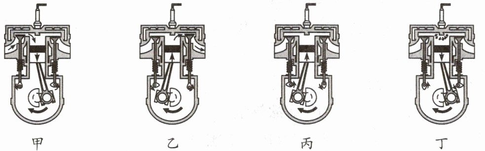 丁图:两气门关闭,活塞向上运动,为压缩冲程。