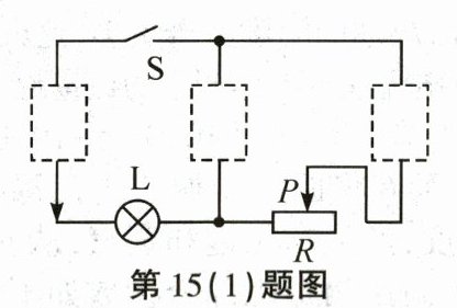 (1)如图所示,将电池、电流表、电压表三个元件符号正确填进图中电路的虚线方框处,要求开关S闭合后电流方向如图所示,移动滑动变阻器的滑片P,小灯泡L变亮时,电流表示数变大,电压表示数变小。