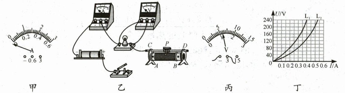 W。 (4)两个额定电压为220 V的白炽灯$L_1和L_2$的电压U与电流I的关系曲线如图丁所示。如果将$L_1和L_2$串联后接在220 V的电源上,则$L_2$的实际功率为