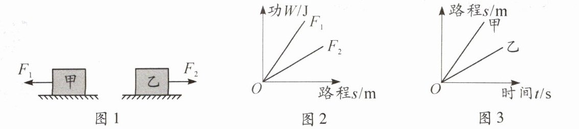 7. 如图1所示,分别用水平拉力$F_1、$$F_2$拉物体甲、乙,使甲、乙在水平面上做直线运动,如图2是$F_1、$$F_2$所做的功—路程图像,如图3是物体甲、乙的路程—时间图像,甲、乙所受的摩擦力分别为fₐ₋、$fᵦ,F_1、$$F_2$所做功的功率是Pₐ₋、Pᵦ,则下列说法正确的是( )