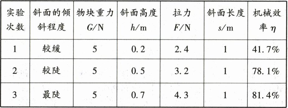 (1) 分析表格中的数据,观察拉力与斜面倾斜程度的关系以及机械效率与斜面倾斜程度的关系。