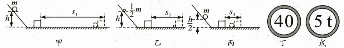 (3)同一小球质量相同,从同一斜面的不同高度由静止释放,高度越高,小球到达水平面时的速度越大。观察到甲图中木块被推出的距离较远,说明小球的动能越大,由此可得到的结论是:当质量一定时,速度越大,物体的动能越大。图丁是限速标志,图戊是限重标志,限速标志是为了控制车辆的速度,因为速度越大,动能越大,在发生碰撞等意外时造成的危害越大,所以图丁运用到了该结论。