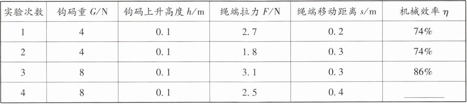 |实验次数|钩码重G/N|钩码上升高度h/m|绳端拉力F/N|绳端移动距离s/m|机械效率η|