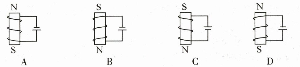 D选项:电流从螺线管上端流入,四指向下弯曲,大拇指指向上方(N极),下端为S极,与图示N上S下不符。