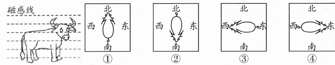 解:地球磁场的磁感线从地理南极附近出发,回到地理北极附近,在地面附近可近似看作沿南北方向。题目中牛的身体朝向与地磁场磁感线平行,即牛的身体应沿南北方向。观察四幅图,①和②中牛的身体为南北朝向,③和④为东西朝向。因此,若报道真实,牛的身体朝向习惯性呈现①和②。