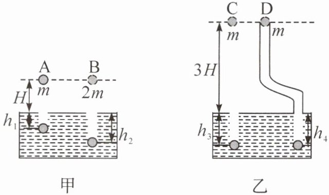 【实验步骤】用上述甲、乙器材做如图所示的四次实验(小球在光滑管道中运动时无能量损失)。实验时让小球从某高度自由下落,小球陷入沙子中静止后,用刻度尺测出小球陷入沙子的深度。