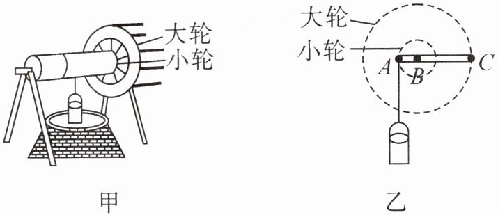 2. 【古代科技】(2023·广东节选)明代宋应星在《天工开物》中记载的农业生产汲水装置——辘轳沿用至今。图甲是一种辘轳,由具有共同转动轴的大轮和小轮组成。提水时,用力使大轮转动,小轮随之转动并缠绕井绳,提起水桶。