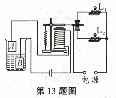 13.如图所示是一种水位自动报警器的原理图,容器中装有盐水,水位到达A时,