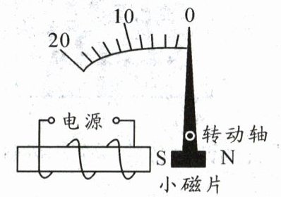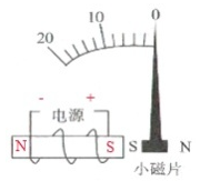 (3)如图所示为电磁铁强弱演示仪,其原理是当电磁铁的磁性增强时,小磁片因受到电磁铁的作用而发生转动,使得磁针指示的数值增大。请在图中标出电源正、负极和电磁铁左端的极性。
