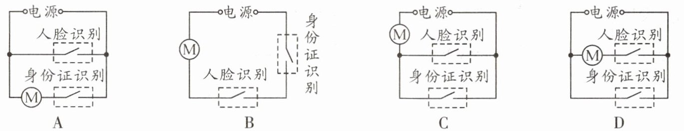 A选项中,人脸识别开关与身份证识别开关并联后与M串联,任一开关闭合M即工作,不符合要求;