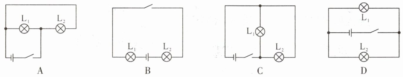 选项D:电流从电源正极流出,在节点处分为两条支路,一条支路经过灯泡$L_1$,另一条支路经过灯泡$L_2$,然后两条支路的电流汇合后回到电源负极,有两条电流路径,灯泡$L_1$、$L_2$是并联的,该选项错误。