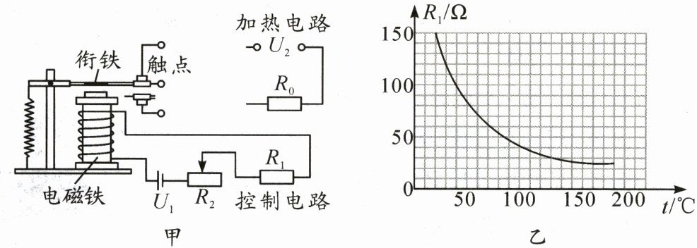 21.如图甲所示是电热恒温箱的原理图,由控制电路和加热电路组成(部分电路尚未连接完整),其中控制电路由$U_1= 6 V$的电源、电磁继电器(线圈电阻忽略不计)、热敏电阻$R_1$和滑动变阻器$R_2$串联而成,加热电路由$U_2= 220 V$的电源和R₀= 48.4 Ω的电热丝组成$,R_1$和R₀置于恒温箱内,图乙是热敏电阻$R_1$的阻值随温度变化的关系图,当控制电路的电流达到0.05 A时,衔铁被吸下来,触点处断开,加热电路停止工作,当控制电路中的电流小于0.05 A时,衔铁被弹回,触点处接通,加热电路正常工作,从而使恒温箱内的温度达到理想的恒温效果,根据上述信息回答下列问题: