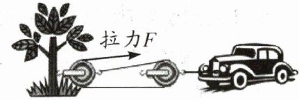 20.一辆质量是$3.5×10^3 kg$的汽车不慎陷入泥泞地面,汽车司机组织人们用如图的滑轮组将汽车拖出。已知整个过程中,水平拉力F保持$1.5×10^3 N,$汽车沿水平方向匀速移动了2 m,滑轮组的机械效率为90%。求: