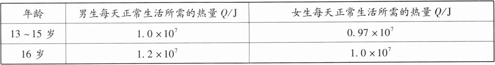 |年龄|男生每天正常生活所需的热量$Q/J$|女生每天正常生活所需的热量$Q/J$|