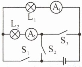 (1)只闭合开关$S_1$、$S_3$时,电流从电源正极流出,经过开关$S_1$后分成两条支路,一条支路经过$L_2$,另一条支路经过$A_1$和$L_1$,然后两条支路汇合经过开关$S_3$回到电源负极。因此,此时$L_1$与$L_2$并联,电流表$A_1$测的是$L_1$支路的电流。