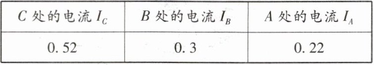 (5)通过对上面数据的分析,可以得出结论:在并联电路中,干路电流等于各支路电流之和。即$I_C = I_B + I_A$,代入数据得$I_C = 0.3A + 0.22A = 0.52A$,与表格中$C$处的电流相符。