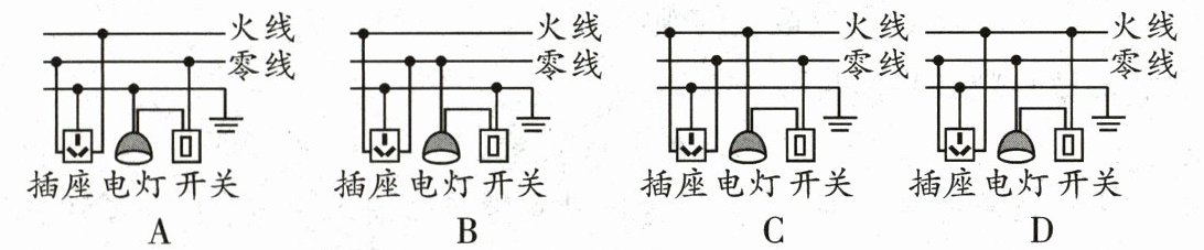 1. 将电灯、开关和插座接入家庭电路中,接线正确的是(