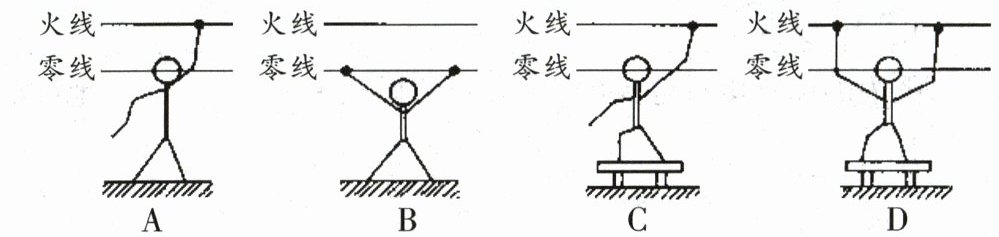 6. 如图所示,A、B两人分别站在地面上,C、D两人分别站在干燥的木凳上,则人会触电的是(