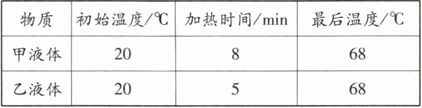3. 如图所示,为比较两种液体的比热容大小,小明用两个相同规格的加热器加热质量相同的甲、乙两种液体。若液体吸收的热量等于电加热器放出的热量,液体均未沸腾,数据记录如下表,则 (