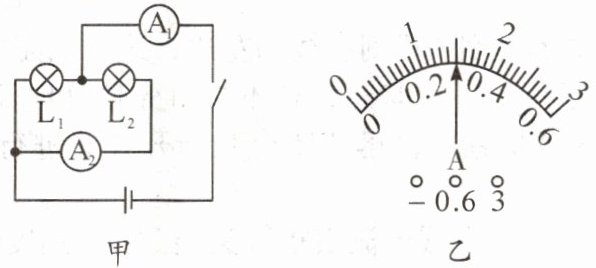 5. 如图甲所示的电路中,闭合开关,两灯泡均发光,且两个完全相同的电流表指针偏转均如图乙所示,通过灯泡$L_1$和$L_2$的电流分别为 (