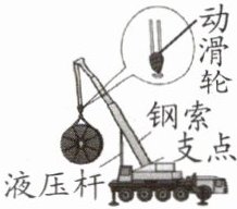 6.如图所示的小型起重机,某次吊起质量为$ 6× 10^{2}\ kg $的物体,电动机的功率为$ 2× 10^{3}\ W $,用时20s,使物体上升了5m。$ g $取10N/kg,则通过动滑轮( )