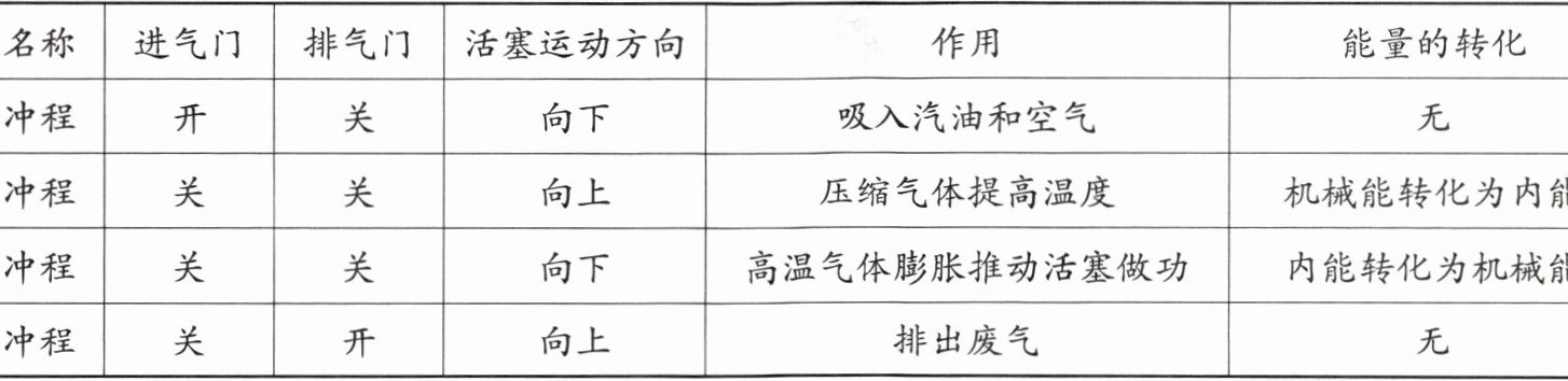 |冲程名称|进气门|排气门|活塞运动方向|作用|能量的转化|