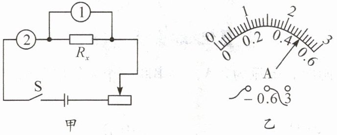 (选填“1”或“2”)处。某次测量时,电压表示数为3 V,电流表指针位置如图乙所示,则本次测得Rₓ的阻值为10