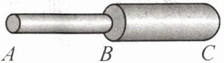 首先,对于电阻的比较,知道电阻的大小与导体的材料、长度、横截面积和温度有关。在本题中,$AB$和$BC$是由同种材料制成的长度相同的两段导体,但它们的横截面积不同。根据电阻的公式$R = \rho\frac{L}{S}$(其中$\rho$是电阻率,$L$是长度,$S$是横截面积),可以得出,在材料和长度相同的情况下,横截面积越小,电阻越大。因此,由于$AB$段的横截面积小于$BC$段的横截面积,所以$R_{AB} > R_{BC}$。