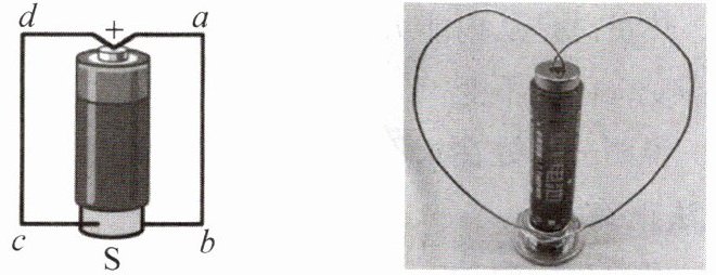 12. 学习了电磁学的知识后,善思好学的小明利用一节电池、一个硬铜导线框和纽扣强磁铁,组装成一个简易电动机。如图所示,同时放手后可观察到导线框abcd以干电池为轴转动起来。导线框转动起来的原理是通电线圈在