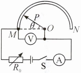 解:由电路图可知,电阻箱$R_0$与半圆弧电阻$MN$的接入部分$R_{OP}$串联,电压表测$R_{OP}$两端的电压,电流表测电路中的电流。
