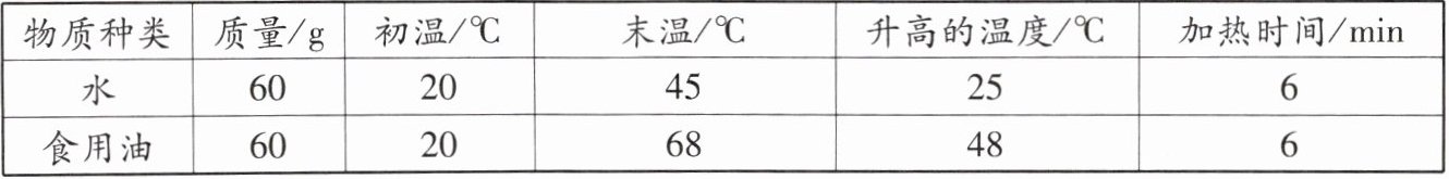 (4)点燃酒精灯,同时对水和食用油加热,加热时间均为6 min,停止加热前分别读出水和食用油的末温,填入表中。
