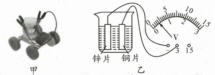 B选项,根据图乙的电压表接线柱的接法可以判断,与电压表正接线柱相连的是电池的正极,所以铜片是电池的正极,不是负极,B选项错误;