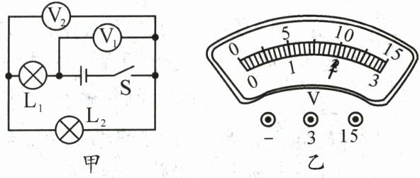 7. 如图甲所示电路中,开关S闭合后,规格不同的灯泡$L_1$和$L_2$均发光,两个电压表的指针偏转均如图乙所示。下列说法正确的是(