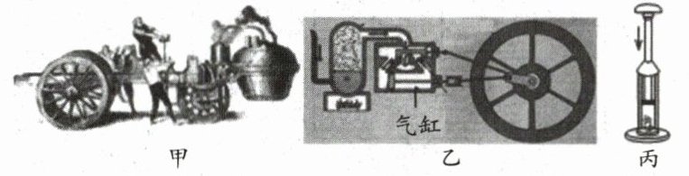 材料一:1769年,法国人居纽制造出蒸汽机推动的三轮汽车(图甲),传统蒸汽机的燃料在气缸外部燃烧(图乙),热效率为5%~8%之间。