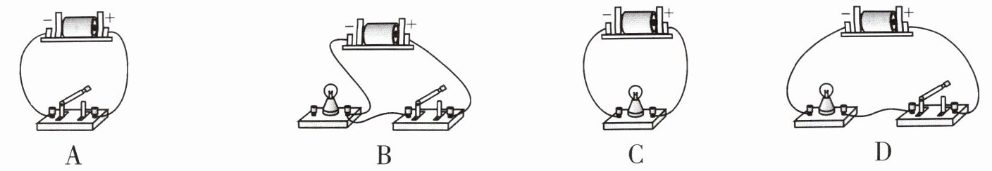 D选项包含电源、用电器、开关和导线,结构完整,能正常工作。