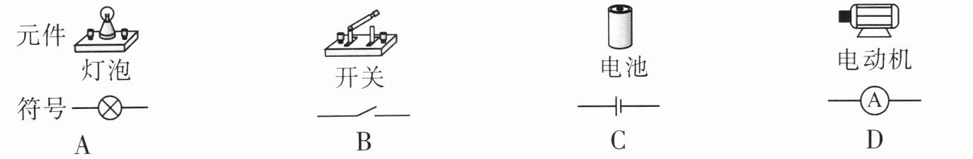 D选项,电动机的符号应为:“M”或者一个圆圈里面有个M,而不是“A”,“A”一般代表电流表,图中的符号代表电流表,故D错误。