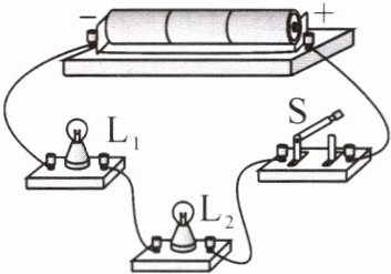 $电源\rightarrow开关\rightarrow分支(一路灯泡,一路灯泡)\rightarrow汇合\rightarrow电源$(图略)