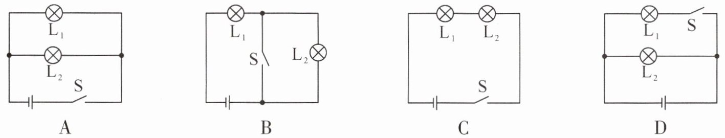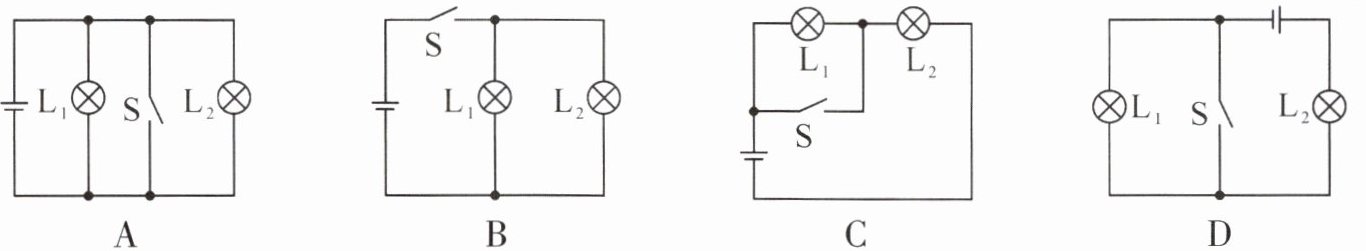 B选项:开关S闭合后,电流从电源正极出发,分为两条支路,一条经L₁回到电源负极,另一条经L₂回到电源负极,两灯泡两端分别连接在一起,属于并联电路,符合题意。