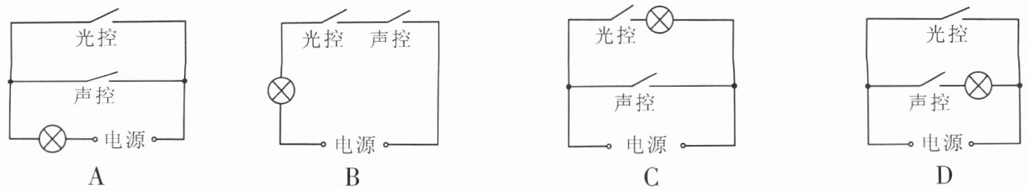 D选项:声控开关与灯并联,光控开关控制整个电路。这不符合题目要求,因为声控开关的状态不影响灯的亮灭。