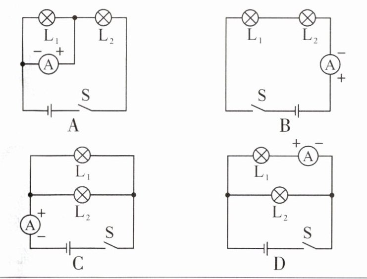 练习2-1 在如图所示电路中,开关S闭合后,能正确测出通过灯$L_1$中电流的是( )