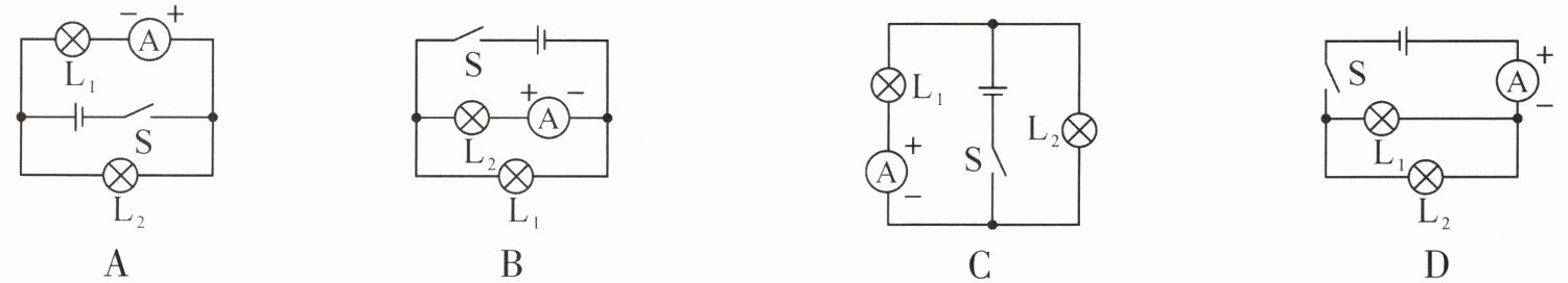 2. 用电流表测量通过灯$L_2$的电流,下面四个电路中正确的是(