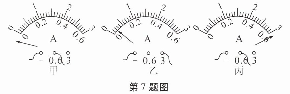 7. 甲、乙、丙三位同学在做“用电流表测电流”的分组实验中,闭合开关前,甲同学的电表如图甲所示。当闭合开关试触时,发现电流表指针摆动分别出现了如图中乙、丙所示的情况。请分析他们在电流表的使用上分别存在什么问题。