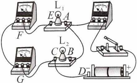 由图可知,电流从电源正极出发,经开关后分为两支:一支经右侧电流表、L₁、导线AB、导线CD、L₂回到电源负极;另一支经右侧电流表、L₁、导线EF、下方电流表回到电源负极。此时L₂被短路,且下方电流表与L₁串联,右侧电流表测干路电流,但缺少测L₂支路电流的电流表。