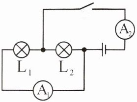 观察电路图可知,电流从电源正极流出,在分支点处分成两条支路,一条支路经过灯泡$L_1$,另一条支路经过灯泡$L_2$,然后两条支路的电流汇合后经过电流表$A_2$回到电源负极,所以灯泡$L_1$、$L_2$是并联的。