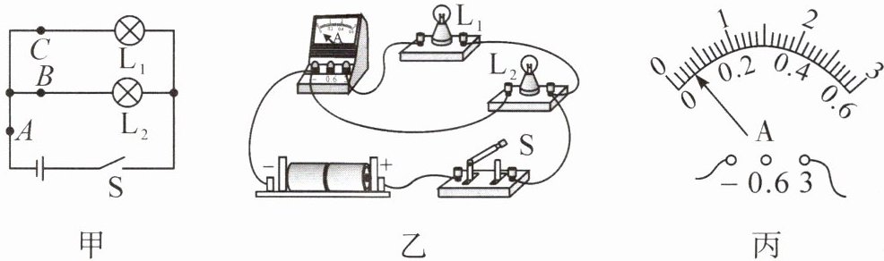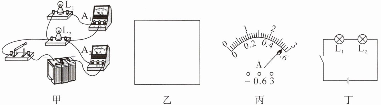 (2)若电流表$A_{1}和电流表A_{2}$的指针均指向同一个位置如图丙所示,则流过$L_{1}$的电流为______A,流过$L_{2}$的电流为______A。