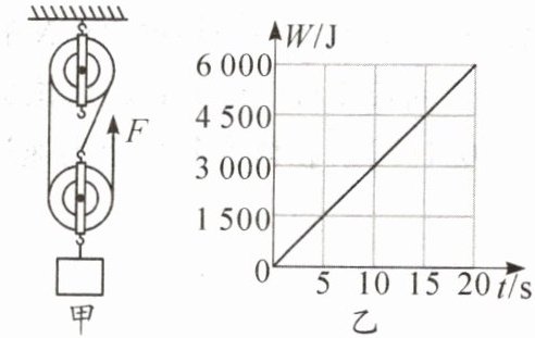 11. 如图甲所示,用滑轮组提升600N的重物,物体在拉力$F$的作用下20s内匀速上升了8m。此过程中,拉力$F做的功W随时间t$的变化图像如图乙所示。求: