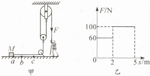 8. 如图甲所示,小欢用力$F$向下拉绳子,使物体$M$在水平地面上匀速移动,地面$ab$、$bc$粗糙程度不同。物体$M$的重力为400N,动滑轮的重力为5N,$s_{ab}= 2m$,$s_{bc}= 3m$。物体$M从a点到c$点的过程中,拉力$F与M移动距离s$的关系图像如图乙所示,不考虑物体大小对运动的影响,忽略绳子重力及机械之间的摩擦。对此过程的分析,下列结论正确的是( )